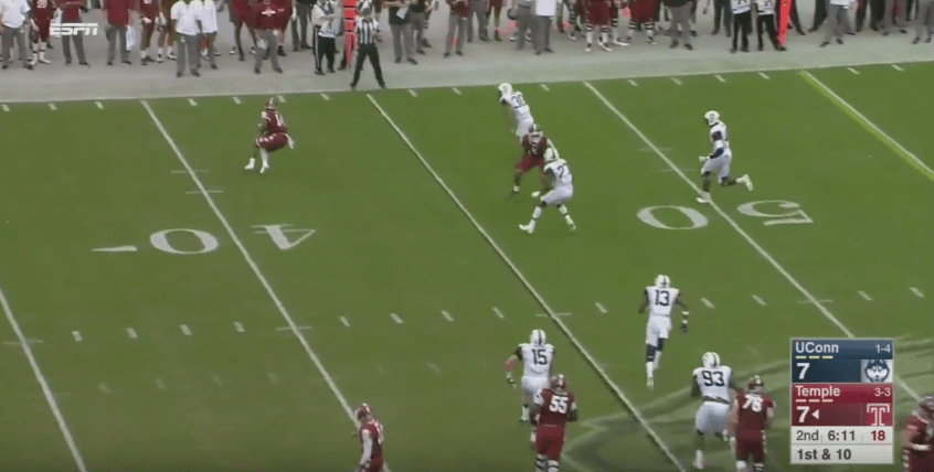 Jordan Swann’s forced fumble, returned deep into Temple territory by Marshe Terry, happened in part because Marschi’s bubble screen throw to Brodrick Yancy was behind him. Still, Swann’s recognition of the play was on point, and look at how much ground he covers while Yancy spins around to go the right way: