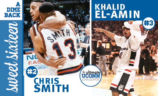 #3 Khalid El-Amin – (1997-2000) by Meghan Bard In Rd 2, El-Amin defeated #11 Taliek Brown, 173-52 In Rd 1, El-Amin defeated #13 Jim Abromaitis, 143-2 Khalid El-Amin always looked like he was having the best time when he played basketball. Like there was nothing in the world he wanted to do more than be on that court. And the attitude was infectious, for his teammates and the fans. He had a showman’s flair when he played, making heart-stopping plays with relative ease. Remember that crazy behind-the-back pass he made to Kevin Freeman in 1999 National Championship game? So amazing. As much as my brother hates the concept of “clutch” players, El-Amin was one. He hit huge shots at the end of games when UConn really needed him to (see: Pittsburgh). He never looked like he was fazed by big moments. He iced two free throws when UConn was up by one point against Duke in the 1999 National Championship when the game was on the line. (And he’s still doing it. Last month he did this. Seriously, guys. Clutch.) El-Amin played with so much fire and spirit, and he always wanted the ball in his hands when it counted. That’s the measure of a great player. He didn’t have the look of an elite athlete; he’s charitably listed at 5’10”, and, well, he wasn’t known for his svelte figure. But that never mattered when the game was on the line. El-Amin was a phenomenally successful high school athlete, and when he came to college he seemed to take an almost childlike delight in riling up, well, everyone. Coach Calhoun, the fans, and definitely the other team, though in different ways. He’s the guy who jumped up on scorers’ tables and announced: “We shocked the world!” There was never a surfeit of passion in his play. When El-Amin came to UConn he brought a little bit of the Minneapolis playground with him. And we love him for it. Career Points: 1650 Career Rebounds: 319 Career Assists: 479 Career Steals: 186 Career Blocks: 10 |